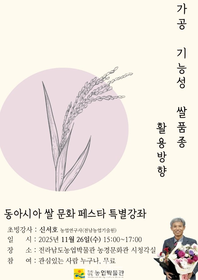 전라남도농업박물관은 26일 오후 3시 ‘동아시아 쌀 문화 페스타’ 다섯 번째 특별강좌를 열어 국내 대표 쌀 품종 개발 전문가를 초청해 미래 쌀 산업의 혁신 모델을 제시한다고 밝혔다. 이번 강좌는 농경문화관 시청각실에서