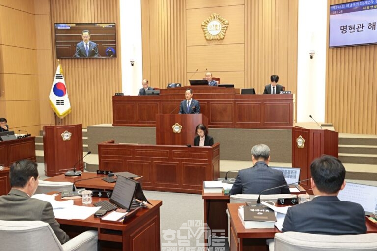 ...명현관 해남군수는 3일 해남군의회 정례회 시정연설을 통해 내년 군정의 목표를 AI·에너지 중심의 대전환을 이루는 대한민국의 변화 속에서 신성장산업과 농어업이 함께 살아 숨 쉬는‘대한민국 농어촌수도 해남’의 미래를 준비하겠다고 밝혔다.