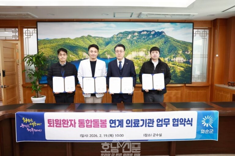 화순군(군수 구복규)은 지난 19일 퇴원환자의 안정적인 지역사회 복귀를 지원하기 위해 「의료·요양 통합돌봄 퇴원환자 연계의뢰」업무협약을 체결했다고 밝혔다. 이번 협약에는 지역 내 급성기 의료기관인 화순고려병원, 화순중앙병원, 화순성심병원이 참여해 의료-요양-통합돌봄 연계·의뢰 체계를 함께