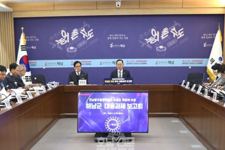 ...해남군은 5일 군청 상황실에서 전남광주통합특별시 설치 특례법 제정에 따른 대응과제 보고회를 개최하고, 통합특별시 출범에 대비한 지역 발전 전략을 종합 점검했다. 이번 보고회는 올해 7월 출범 예정인‘전남광주통합특별시’에 대한 행정·경제적 환경