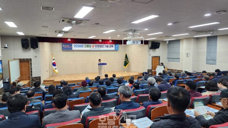 화순군(군수 구복규)은 지난 6일 농업기술센터 대강당에서 쌀 전업농 등 농업인 101명을 대상으로 고품질 쌀 생산 기반 구축과 기후변화 대응 재배기술 강화를 위한 ‘2026년 고품질 쌀 안정생산 기술교육’을 실시했다고 밝혔다. 이번