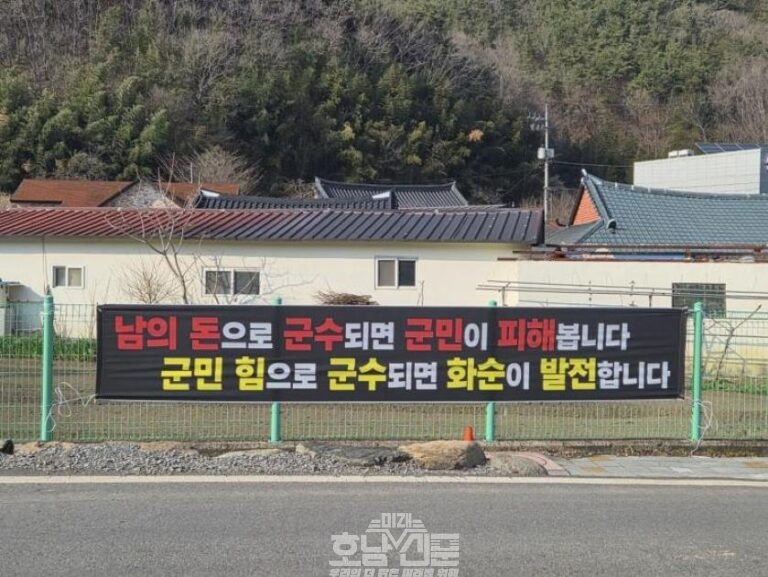 ...전남 화순군에서 공정한 선거를 요구하는 군민들의 목소리가 점차 확산되고 있다. 최근 화순 지역 한 도로변에는 “남의 돈으로 군수되면 군민이 피해봅니다. 군민 힘으로 군수되면 화순이 발전합니다”라는