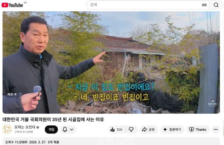 단일화를 진행중인 더불어민주당 전남광주통합특별시장 신정훈 후보가 출연한 51 만 유튜브의 조회수가 폭발하면서 , 경선에서 또 다른 흥미요소가 되고 있다 . 28 일 51 만 5 천명이 구독중인 유트브 ‘ 오지는 오진다 ’ 는 27 일 밤 9 시에 전남광주특별시장 신정훈 후보편인 ‘ 대한민국 거물 국회의원이 35 년
