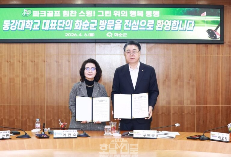 화순군(군수 구복규)은 지난 6일 화순군청 소회의실에서 동강대학교와 파크골프 활성화를 위한 업무 협약을 체결했다고 밝혔다. 이번 협약은 화순파크골프장을 동강대학교의 파크골프 교육 프로그램 현장 실습 교육장으로 활용하고, 화순군민에게도 교육 참여 기회를 제공해