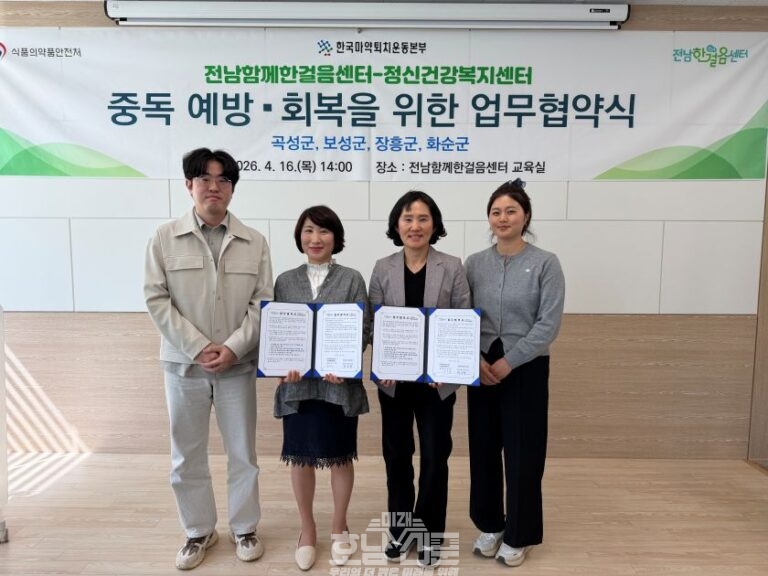 화순군(군수 구복규)은 지난 16일 화순군정신건강복지센터(센터장 정강영)가 전남함께한걸음센터와 지역사회 마약류 및 약물 오남용 예방과 회복 지원 강화를 위한 업무협약(MOU)을 체결했다고 밝혔다. 전남 순천시에 소재한 전남함께한걸음센터는 정신건강전문요원과 심리상담사 등 전문가가 지역사회 내