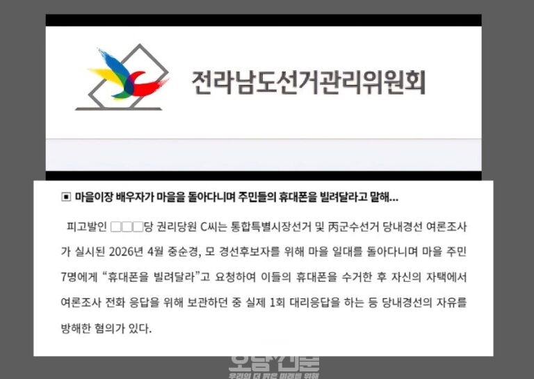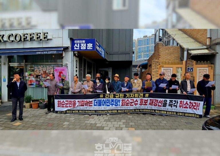 화순지역 시민사회단체로 구성된 ‘지역정치 개혁을 위한 화순군민연대’가 더불어민주당의 화순군수 후보 재경선 방침을 정면 비판하고 나섰다. 화순군민연대는 23일 화순 민주당사 앞에서 성명서를 발표하고, 민주당이 대리투표 의혹