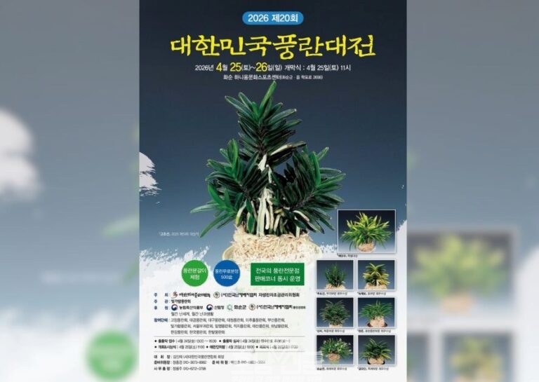 화순군(군수 구복규)은 오는 4월 25일부터 26일까지 이틀간 ‘2026 제20회 대한민국 풍란대전’을 개최한다고 밝혔다. (사)대한민국풍란연합회가 주관·주최하는 이번 행사는 전국 풍란 애호가들이 참여해 우수한 풍란 작품을 선보이는 국내 최대 규모의 풍란 전시