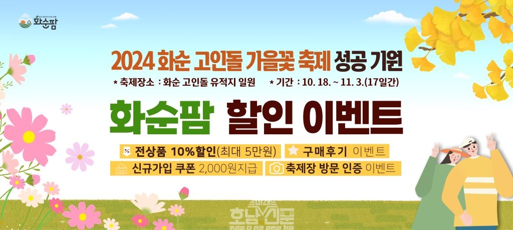 화순군(군수 구복규)은 ‘2024 화순 고인돌 가을꽃 축제 성공을 기원하기 위하여 화순팜에서 전 상품 10% 할인 이벤트를 실시한다고 14일 밝혔다.