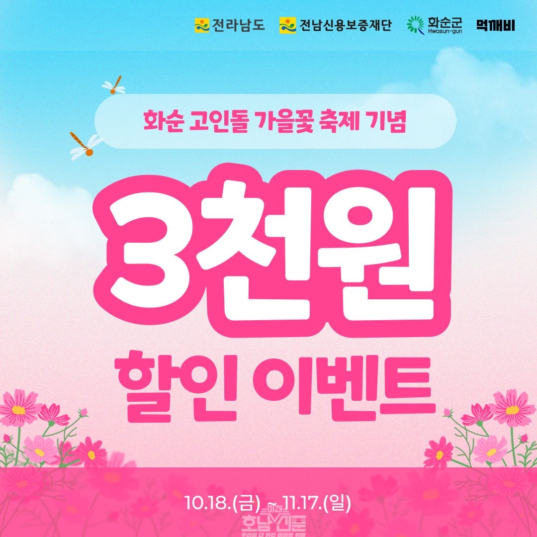 화순군(군수 구복규)이 10월 18일부터 11월 17일까지 공공배달앱 ‘먹깨비’에서 화순 고인돌 가을꽃 축제 기념 이벤트를 진행한다고 밝혔다.
