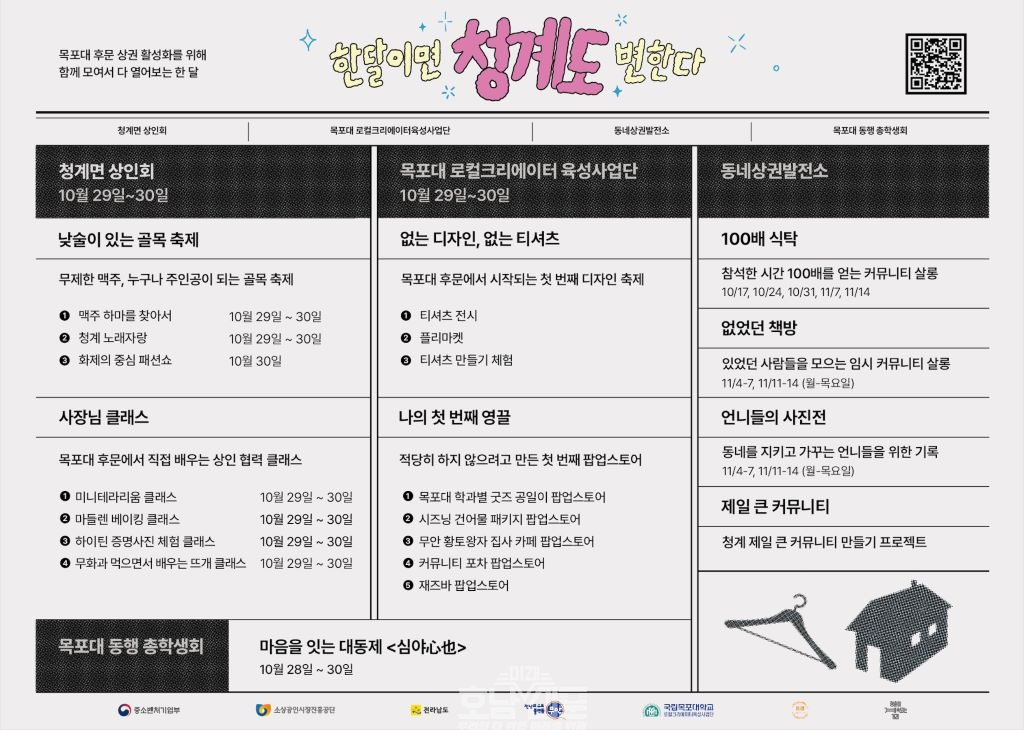 이 프로젝트는 전남도, 무안군, 청계면상인회, 목포대 로컬크리에이터육성사업단·총학생회가 함께 추진한다. 지난 17일부터 8가지 세부 행사가 시작됐다. 로컬 커뮤니티 살롱인 ‘100배 식탁’과 ‘없었던 책방’, 상권 아카이빙 프로젝트인 ‘언니들의 사진전’ 등이 열리고, 상인 협력 클래스 ‘사장님 클래스’도 선보인다.