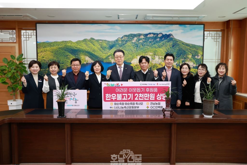 화순군(군수 구복규)은 화순축협(조합장 정삼차), 축사모(회장 소봉순), GC인백팜(대표 이인규), (사)나눔축산운동본부(사무총장 이종원)에서 어려운 이웃을 위해 2000만원 상당의 한우불고기 500박스를 기부했다고 밝혔다.