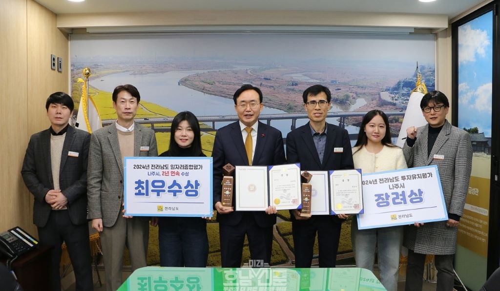 전라남도 나주시(시장 윤병태)는 2024년 전라남도 일자리·경제 한마당에서 일자리 창출 분야 ‘최우수상’을 2년 연속 수상하며 일자리 정책의 선도 지자체임을 다시 한번 입증했다. 또한 투자유치 분야에서도 ‘장려상’을 수상하며 두각을 나타냈다.