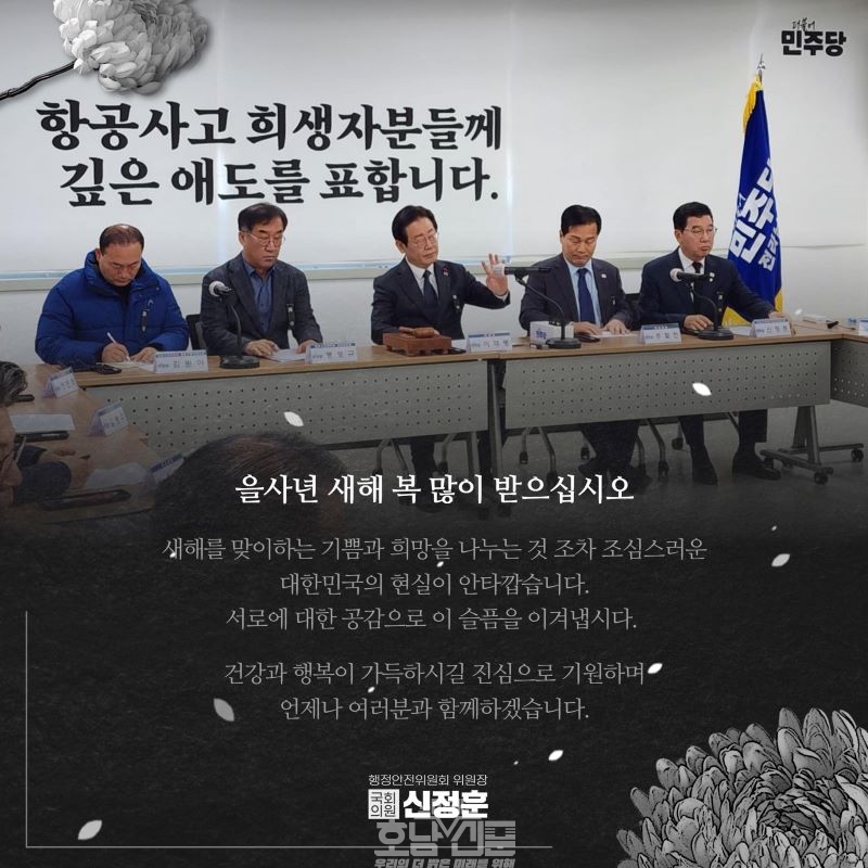 신 위원장은 “새해에는 고통과 슬픔 없는 평화로운 세상이 되길 바란다”며, “상상도 할 수 없는 참사로 희생되신 희생자들과 견디기 힘든 슬픔을 겪고 있는 유가족들에게 깊은 애도와 연대의 마음을 전한다”고 전했다.