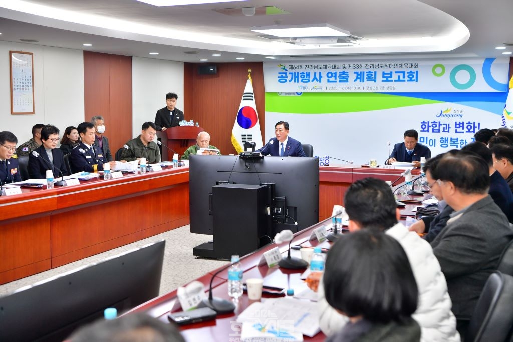 군은 8일 유관기관장, 도‧군의원, 체육회 관계자들이 참석한 가운데 군청 상황실에서 제64회 전라남도체육대회, 제33회 전라남도장애인체육대회 공개행사 연출계획 보고회를 가졌다.