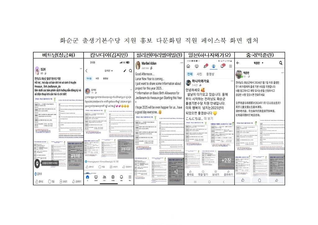 화순군은 홍보와 이해 부족으로 다문화가족들이 혜택을 놓치는 사례가 없도록 출생기본수당 지원정책과 관련한 내용을 베트남·캄보디아·필리핀·일본·중국 5개 국어로 번역하여 SNS 홍보에 나섰다.