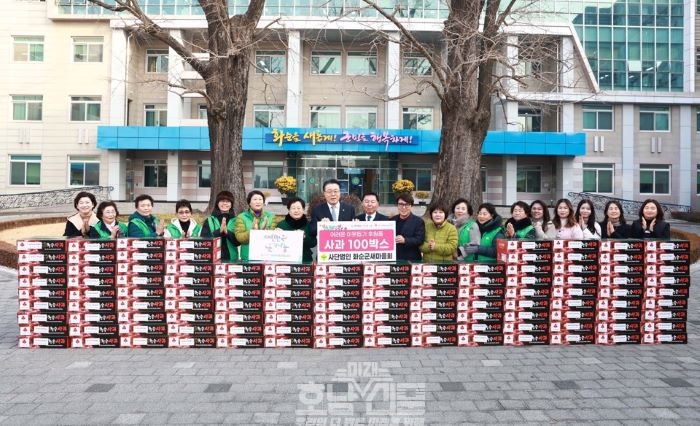 이날 화순군 새마을회와 새마을부녀회는 화순군청을 방문하여 관내 취약계층 주민과 복지시설 그리고 다문화 가정에 나눠달라며 600만 원 상당의 청송 사과 120박스와 200만 원 상당의 생필품을 화순군에 전달했다.