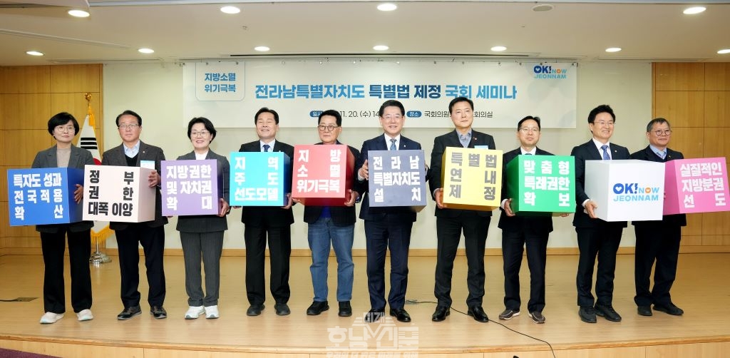 지난해 7월에는 전남 국회의원 10명이 함께 ‘전라남특별자치도 특별법 제정 촉구 성명서’를 발표했고, 11월에는 전남 국회의원 전원 공동 주최로 ‘국회 세미나’를 개최해 전국적인 공론화와 함께 국회, 정부의 관심을 이끌어냈다.