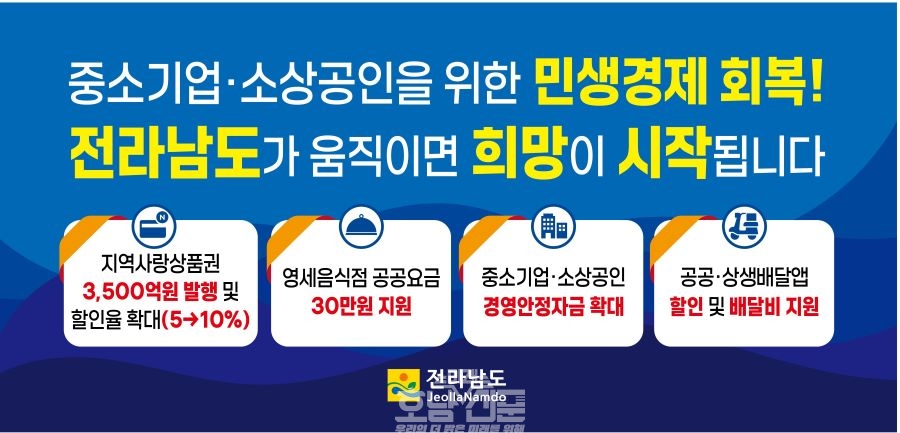 김영록 전남도지사는 “이번 민생경제 지원책은 중소기업과 소상공인의 경영난을 완화하고, 소비와 생산의 선순환 구조를 강화하기 위한 종합지원책”이라며 “도민이 체감할 경제회복 효과를 만들기 위해 최선을 다하겠다”고 밝혔다.