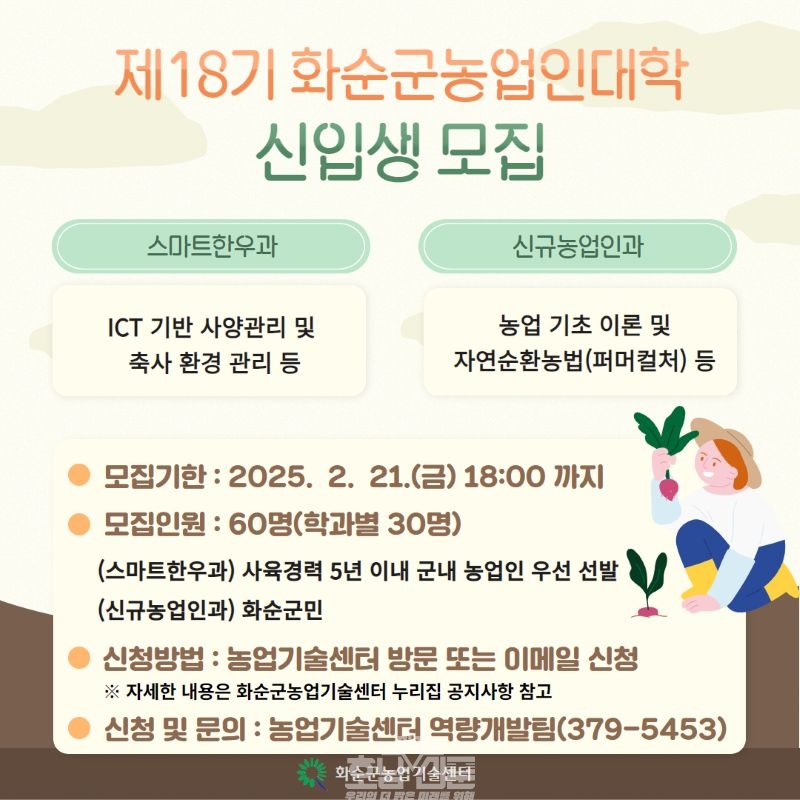 화순군(군수 구복규)은 지역 농업 특화 발전을 위한 전문 인력 양성을 위해 ‘2025년도 화순군농업인대학 신입생 모집을 2월 21일까지 신청·접수한다고 밝혔다.