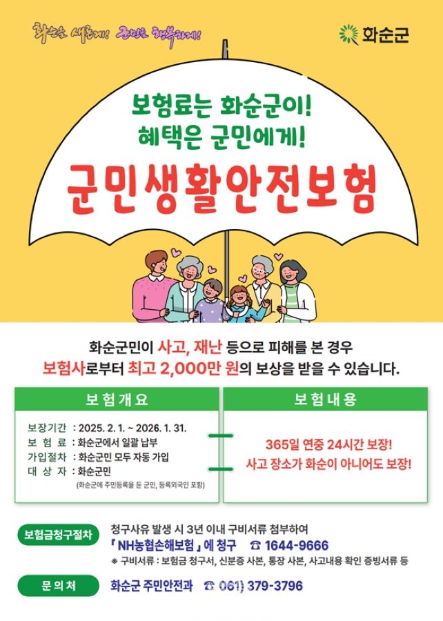 화순군(군수 구복규)은 일상생활 중 예상치 못한 재난 및 안전사고 등으로 피해를 본 군민들의 생활 안정을 지원하기 위해 ‘2025년 군민생활안전보험’을 갱신 가입 ‧ 시행한다고 지난 4일 밝혔다.