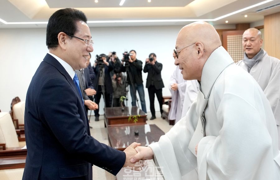 김영록 전라남도지사는 11일 대한불교조계종 총무원을 방문해 총무원장 진우스님을 예방하며 제주항공 여객기 사고 애도 및 피해자 지원활동에 감사 인사를 전하고, 올해 화두로 제시한 ‘소통’·‘화쟁’에 공감을 표했다.