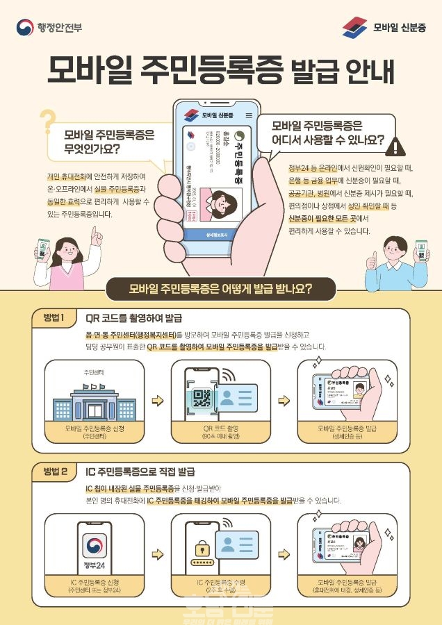 발급 대상은 17세 이상 주민등록증을 발급받은 주민으로, IC주민등록증과 QR코드 방식 중 선택할 수 있다. 신청자는 본인 명의의 휴대전화에 ‘대한민국 모바일 신분증’ 앱을 설치해야 한다.