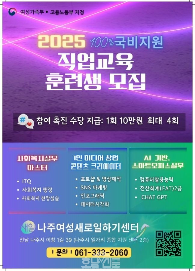 자세한 사항은 나주여성새로일하기센터(061-333-2060) 전화상담 및 방문 상담으로 문의하면 된다.