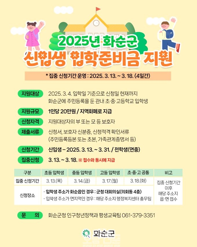 입학준비금 지원 대상은 2025년 3월 4일 기준으로 화순군에 주민등록을 두고 관내 초·중·고등학교에 입학하거나 전입하는 1학년 학생이다.
