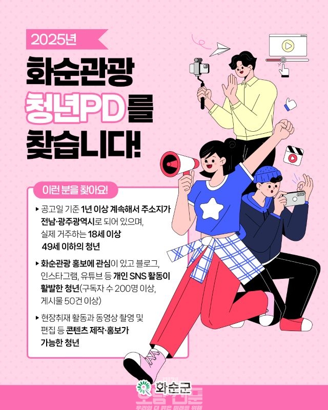 화순군(군수 구복규)이 지역 청년들의 창의적인 감각과 SNS 역량을 활용해 화순 관광을 홍보하는 ‘화순 관광 청년PD’를 모집한다.