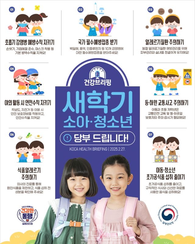 봄 환절기에 유행하는 감염병으로는 ▲노로바이러스 ▲인플루엔자 바이러스 ▲수두 ▲유행성이하선염 등이 있다. 이와 같은 감염병을 예방하기 위해서 개학 시기 어린이의 예방접종 기록을 확인해 표준 일정에 따라 접종하고, 누락 접종 발견 즉시 예방접종을 실행하는 것이 중요하다.