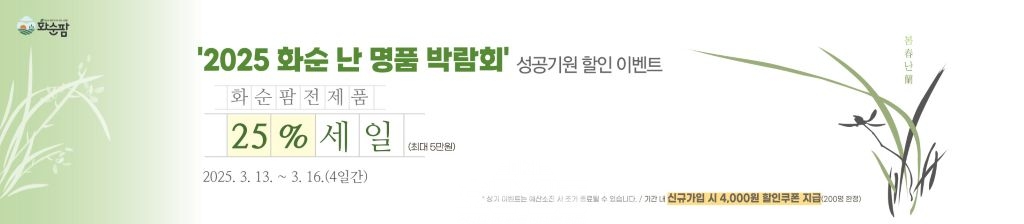 25% 할인 쿠폰은 전 품목에 최대 5만 원 한정으로 화순팜의 회원에만 적용되며, 본 이벤트 기간에 가입한 신규회원 중 선착순 200명에게는 4,000원 할인 쿠폰이 지급된다.