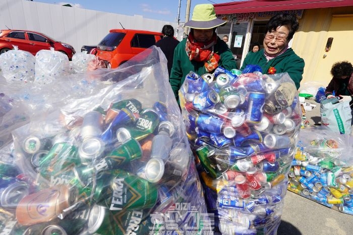 매주 화요일 해남군 화산면사무소 앞 땅끝희망이 자원순환가게 앞마당은 면내 43개 마을에서 출동한 주민들로 북새통을 이룬다. 마을에서 수집한 페트병과 캔, 플라스틱 등이 가득찬 자루가 연달아 내려지고, 너나할 것 없이 손을 보태 다시 한번 정밀하게 분류작업을 갖는다.