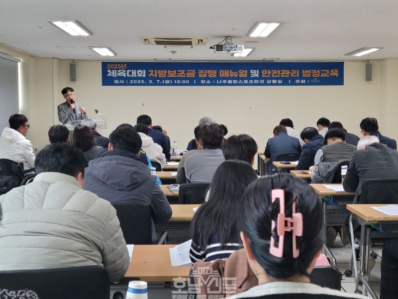전라남도 나주시(시장 윤병태)는 최근 나주종합스포츠파크 종합상황실에서 체육단체 관계자 30여 명을 대상으로 지방보조금 집행 매뉴얼 및 안전관리 법정교육을 실시했다고 14일 밝혔다.