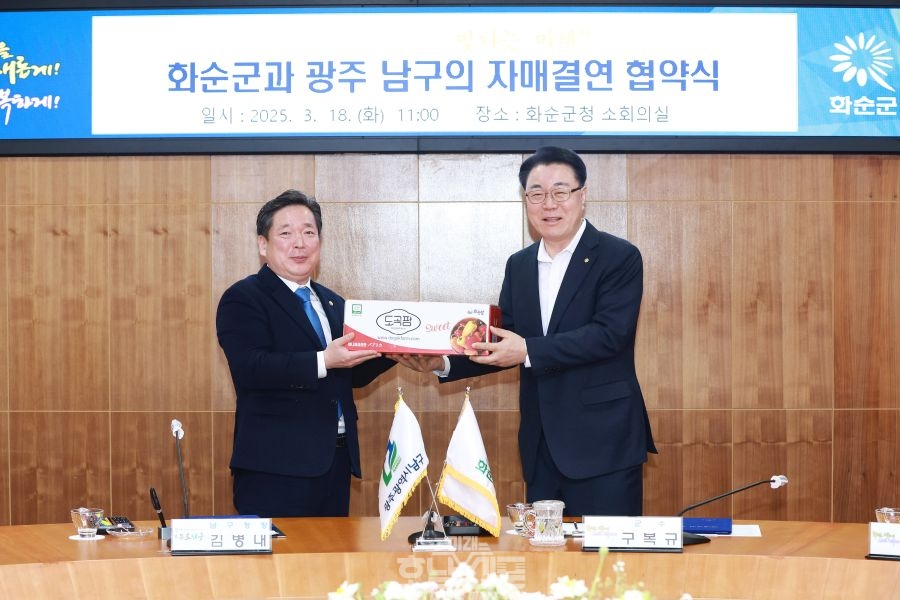 화순군(군수 구복규)은 지난 3월 18일 화순군청 소회의실에서 광주광역시 남구(구청장 김병내)와 상호 협력과 공동의 발전을 위한 자매결연 협약식을 개최했다.