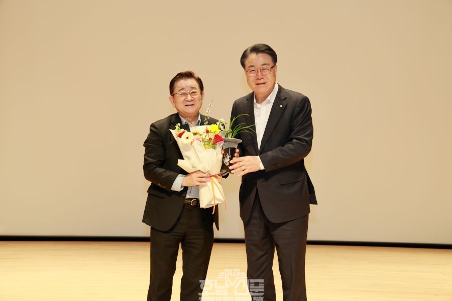 이홍렬 강사에게 꽃다발과 난을 전달하는 구복규 화순 군수