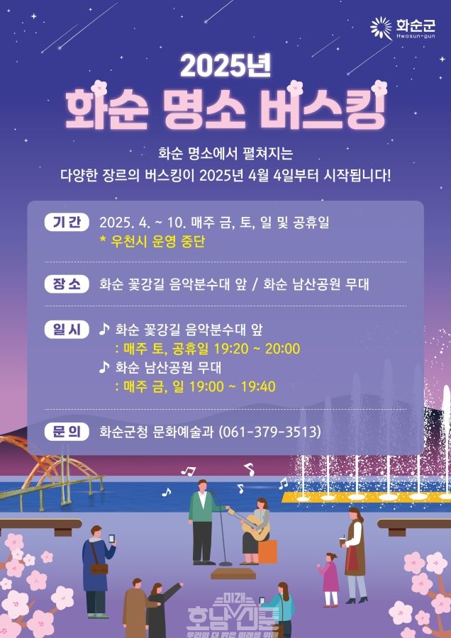 화순군(군수 구복규)은 오는 4월 4일 금요일부터 매주 주말(금~일)과 공휴일에 화순 꽃강길 음악분수대 앞, 남산공원 등 화순 명소에서 버스킹 공연을 실시한다고 밝혔다.