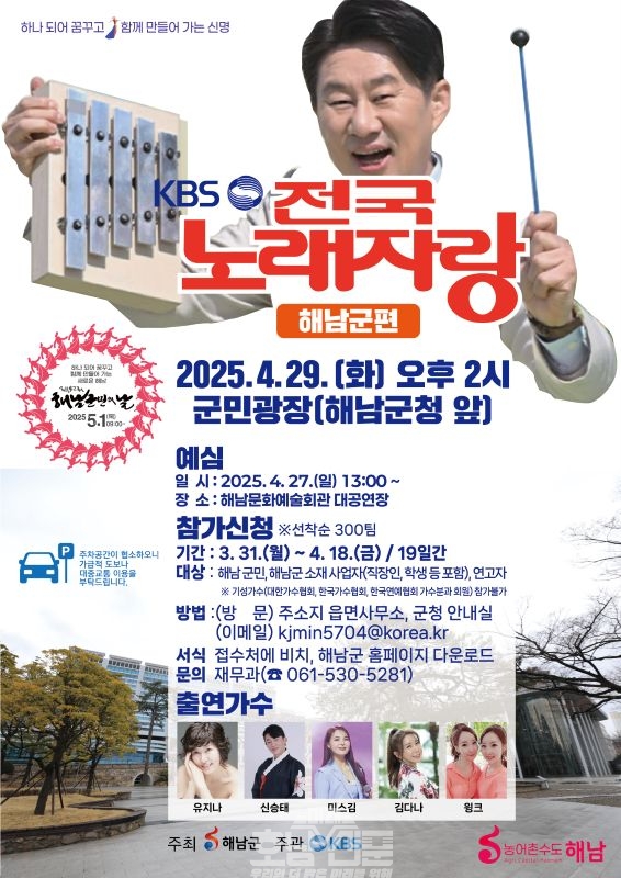 특히 이와 관련해 전국노래자랑의 주인공인 일반 출연자 예심 접수가 시작됐다. 예심참가는 기성 가수를 제외한 군민 누구나 신청 가능하며 오는 4월 18일까지 각 읍면사무소, 군청 안내실을 직접 방문 신청하거나 해남군 누리집 군정 알리미에서 신청서를 내려받아 이메일(kjmin5704@korea.kr)로 접수 가능하다.