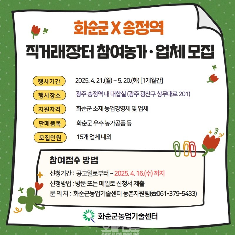 화순군(군수 구복규)은 4월 21일부터 5월 20일까지 1달간 광주 송정역에서 추진 예정인 ‘송정역 고향뜨락’ 직거래장터에 참여할 우수 농업경영체 15개소를 4월 16일까지 모집한다고 밝혔다.