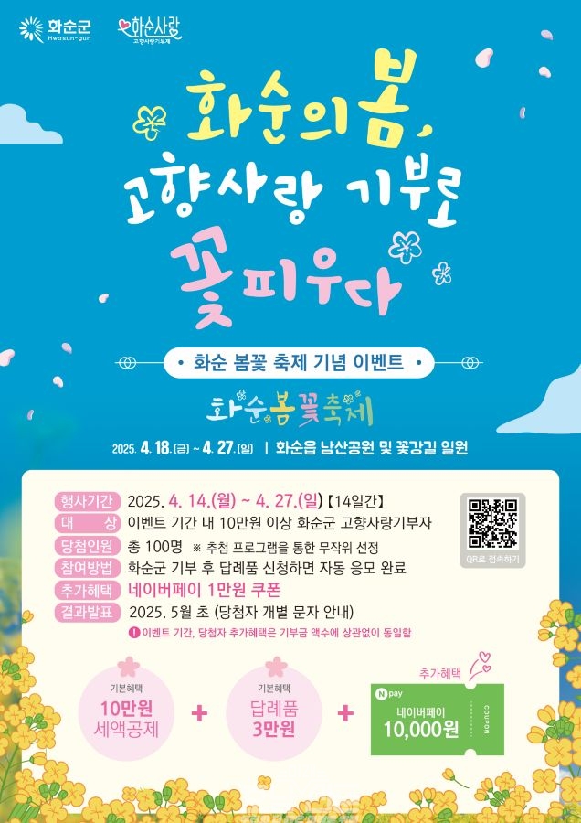 화순군(군수 구복규)은 2025년 화순 봄꽃 축제를 맞아 고향사랑기부제 홍보 이벤트인 ‘화순의 봄, 고향사랑 기부로 꽃피우다!’를 오는 4월 14일부터 4월 27일까지 진행한다고 밝혔다.
