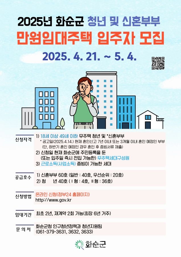 화순군(군수 구복규)은 14일 청년 및 신혼부부를 위한 ‘2025년『만원 임대주택』 입주 신청자를 4월 21일부터 5월 4일까지 2주간 정부24를 통해 신청·접수한다고 밝혔다.