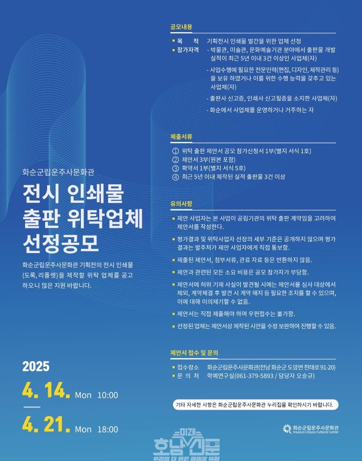 인쇄물 출판 위탁업체 선정 공모 기간은 4월 14일(월)부터 4월 21일(월)까지 8일간이며, 제안서 접수는 2025년 4월 14일(월)부터 4월 21일(월) 18시까지, 휴무일을 제외한 7일간 진행된다. 접수는 화순군립운주사문화관을 방문하거나 등기우편으로 제출하면 된다.