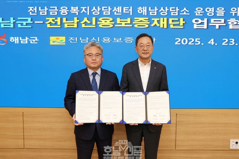 해남군은 23일 금융복지상담센터 해남상담소의 효과적인 운영을 위해 전남신용보증재단과 업무협약(MOU)을 체결하고, 지역 주민의 금융복지 향상과 자립 지원을 위한 협력 체계를 구축해 나가기로 했다.