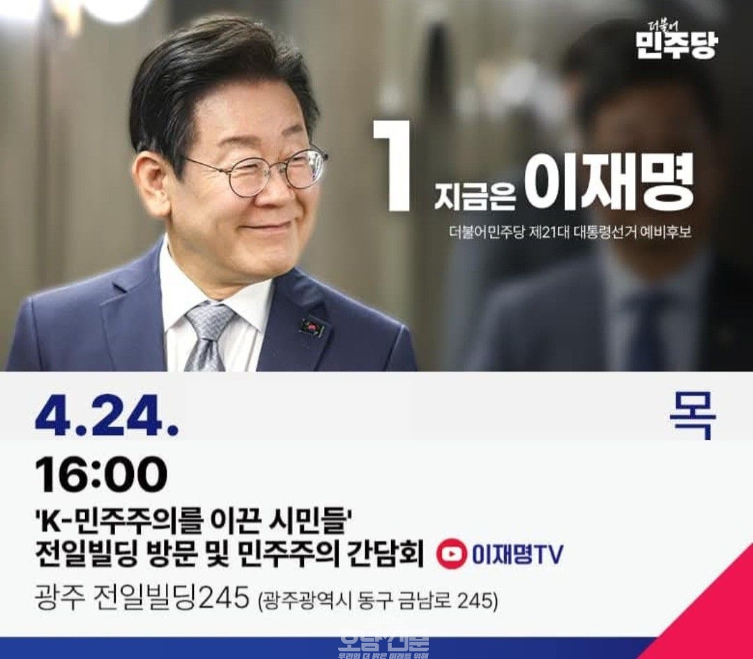 이재명 더불어민주당 대선 경선 후보는 24일 광주 동구 전일빌딩 245에서 열린 간담회에서 “광주의 영령들이 결국 2024년 12월 3일의 대한민국 국민들을 살렸다”며, 최근 ’12·3 비상 계엄 사태’를 언급하며 시민들의 민주주의 수호를 강조했다.