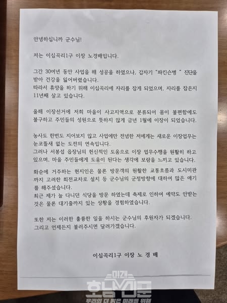 편지에는 이장 업무에 대한 고군분투와 보람, 그리고 화순군 발전에 대한 깊은 애정이 담겨 있었다. 특히 노 이장은 구복규 군수가 추진하는 회전교차로 설치 등 군정 방향에 대해 주민과 방문객 모두 긍정적인 반응을 보이고 있다며, 화순군 발전을 응원하는 마음을 전했다. 그는 “언제든지 불러주시면 달려가겠습니다”는 말로 군수에 대한 신뢰와 지원의 뜻도 밝혔다.