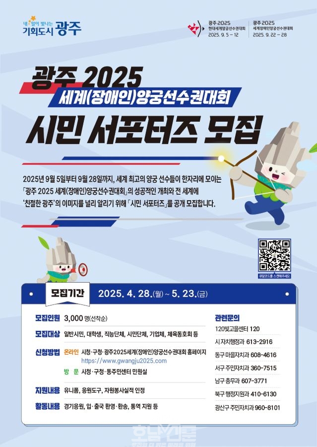 광주광역시(시장 강기정)는 오는 9월 열리는 ‘광주 2025 현대세계양궁선수권대회 및 세계장애인선수권대회’의 성공 개최를 위해 시민 서포터즈 3290명을 모집한다.