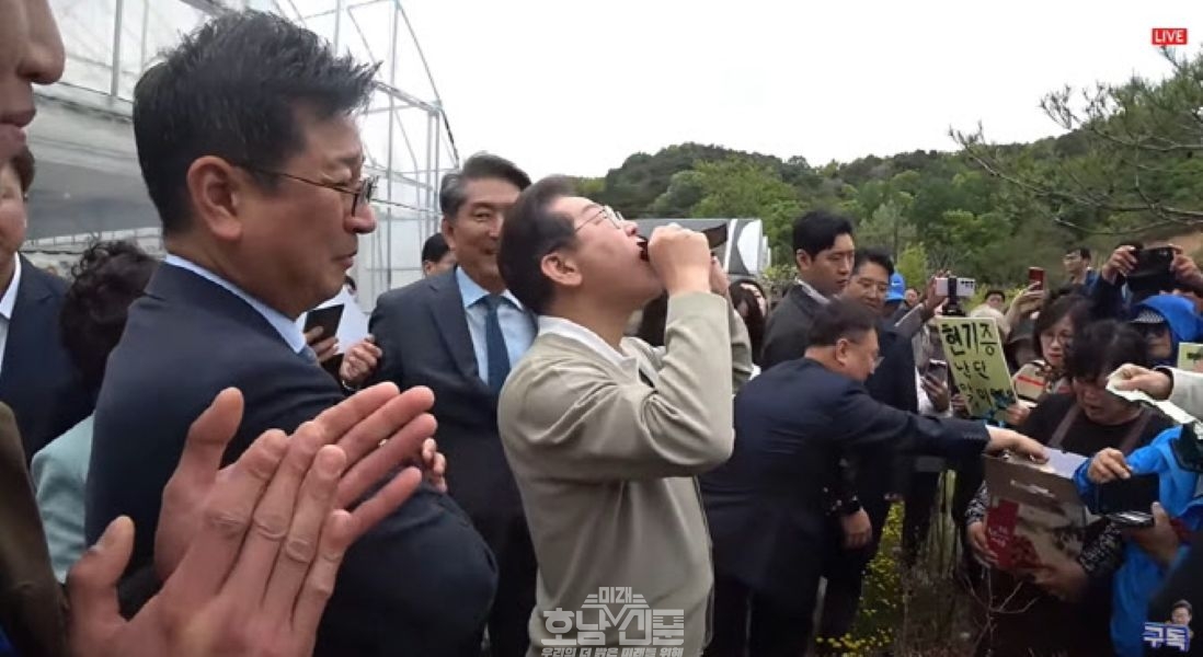 이재명 더불어민주당 대통령 후보가 최근 충북 보은에서 진행된 ‘골목골목 경청투어’ 중 지지자로부터 받은 건강식품 앞에서 “내가 또 처벌 받을까 봐 그래요”라며 조심스러운 반응을 보였다. 이는 그가 최근 겪고 있는 검찰 수사와 공직선거법 위반 재판을 에둘러 풍자한 것으로 해석된다.