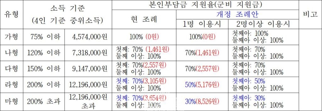 주요 개정 내용은 본인부담금의 군비 지원율 변경과 첫째, 둘째 이상 문구를 변경하였다. [참조 : 표 1]