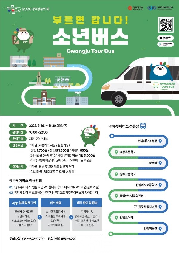 자세한 내용은 광주문화관광 오매광주 누리집(tour.gwangju.go.kr)과 광주관광공사 대표 누리집(www.gjto.or.kr)에서 확인할 수 있다. 광주투어버스 앱은 애플 앱스토어와 구글 플레이스토어에서 내려받을 수 있다.