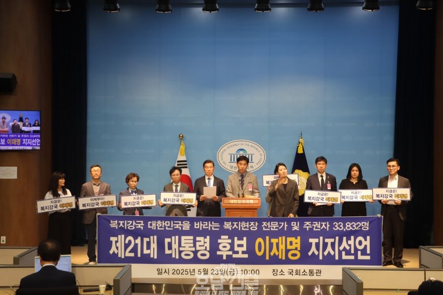 전국 각지에서 활동 중인 복지현장 전문가들이 5월 23일 국회 소통관에서 더불어민주당 이재명 대통령 후보에 대한 공개 지지를 선언했다. 이날 선언에는 복지주권자 33,832명을 대표하는 전국 복지 분야 전문가 9인이 함께했다.