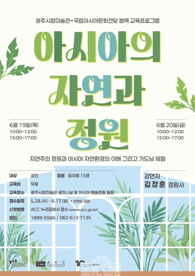 광주시립미술관은 오는 6월 19일부터 20일까지 이틀간 시립미술관 세미나실과 중외근린공원 내 아시아예술정원에서 ‘아시아의 자연과 정원’ 예술교육 프로그램을 운영한다.